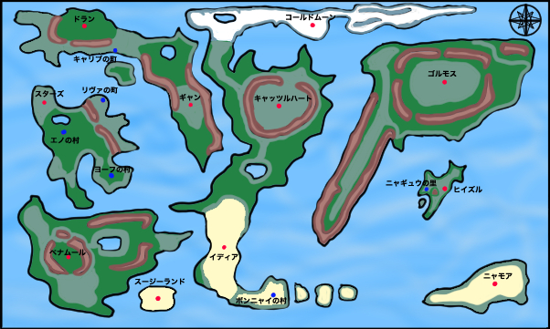 ▪️ヒイズル:他国とは交流が少ない島国。首都は「エイドゥ」。独自の文化より生まれた戦士「侍」が国を守っている